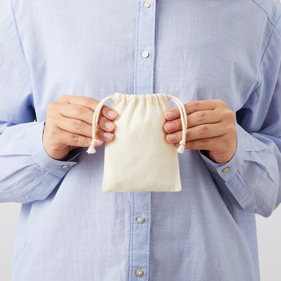 ギフトパッケージの定番であるコットン巾着のSSサイズです。鍵や携帯アクセサリーなどの小物をまとめるのに最適なサイズとなっており、バッグの中の整理にも便利です。お菓子やアクセサリーなどを入れたり、ほかのサイズとのセット販売もおすすめです。 ・本体サイズ:約W100×H130(mm) ・素材:コットン