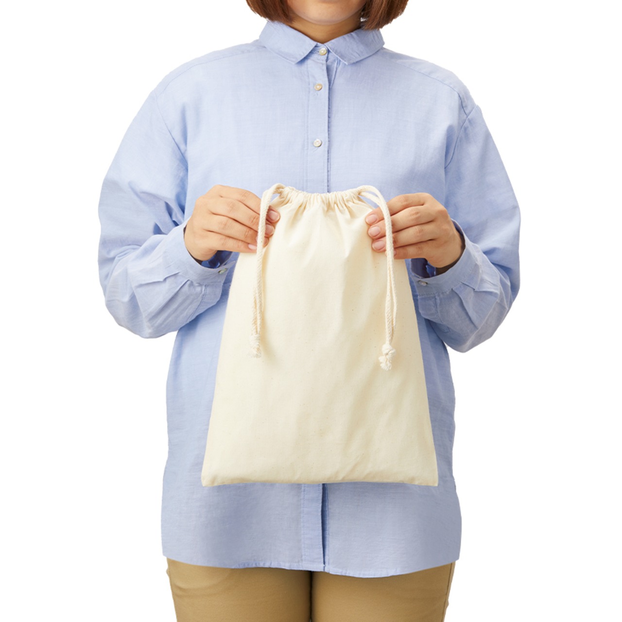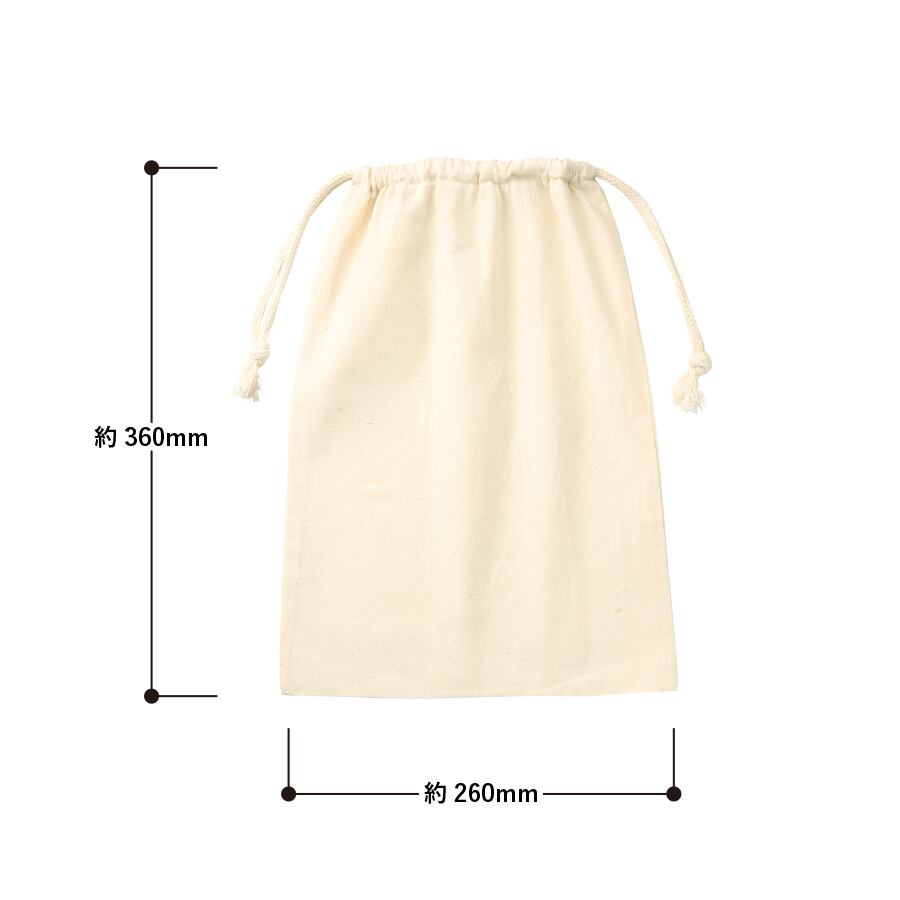 商品パッケージやギフト包装としてもご好評をいただいている使い勝手の良いコットン巾着です。A4サイズも余裕を持って収容でき、やわらかい生地感が中に入れる商品をやさしく包み込みます。 ・本体サイズ:約W260×H360(mm) ・素材:コットン